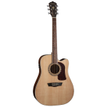 The D10SCE is a dreadnought cutaway acoustic/electric guitar. It features a solid Sitka spruce top and Cathedral Peaked Scalloped-X bracing for superior tone that improves with age. A mahogany back, sides and neck, an Ovangkol fingerboard and bridge, die-cast tuners for quick, easy and accurate tuning, a Washburn tortoise pick guard and a Washburn “Heritage” rosette. The cutaway makes it easy to reach the uppermost frets. With its built in premium Fishman Presys II 301T Tuner/Preamp, you’ll never have to carry a tuner with you and it’s plug-in ready.